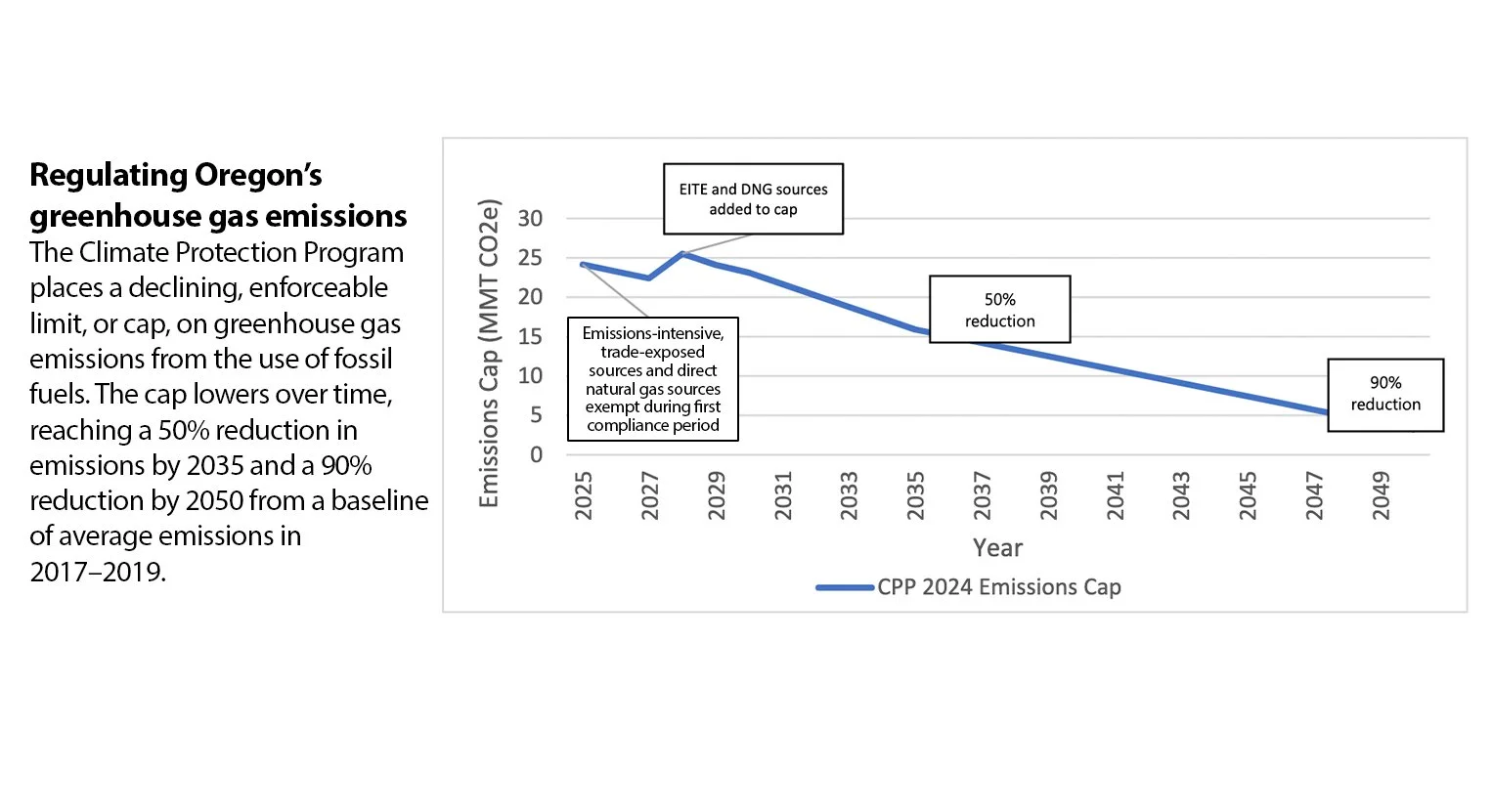 Under the CPP, emissions must decline annually (see graph above). Users must consume less fuel or switch to cleaner energy sources. If consumers fail to meet the schedule DEQ established, the wholesale suppliers that serve them (NW Natural, Cascade Natural Gas, and Avista in the case of natural gas) must purchase “community compliance investment” credits, effectively paying a penalty, which the suppliers pass on to their customers.